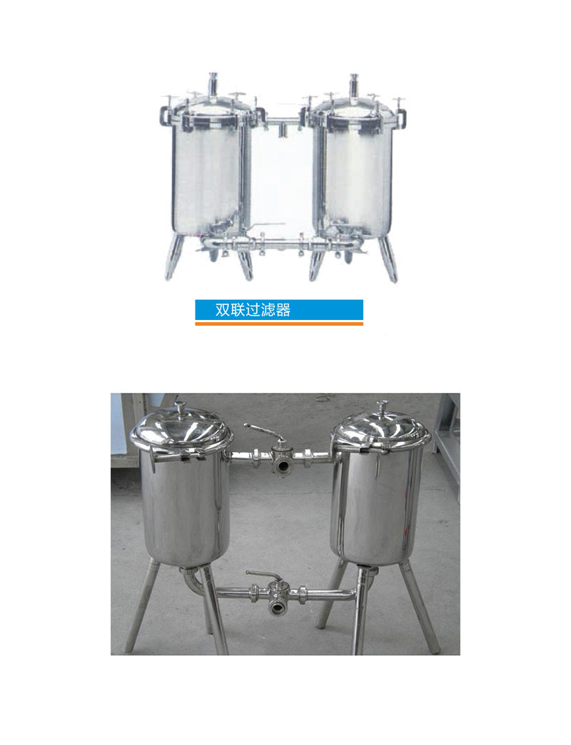 雙聯(lián)式過(guò)濾器全部采用SUA304優(yōu)質(zhì)不銹鋼制造,是二只圓柱體組成,內(nèi)外表面拋光0.4μm,頂部裝有壓力表、排氣閥,適用于除去鮮奶、糖液、飲料、口服液等液體中各種肉眼看不見(jiàn)的固體雜質(zhì)的凈化。兩只過(guò)濾器交替適用,可在不停機(jī)的情況下更換過(guò)濾網(wǎng),適于長(zhǎng)期連續(xù)生產(chǎn)。